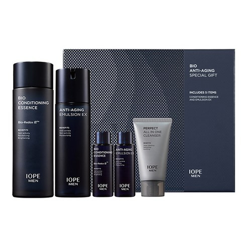 아이오페의 이 기획세트는 안티에이징을 위한 제품으로, 남성들에게 설계된 세련된 패키징과 실용성을 강조합니다.