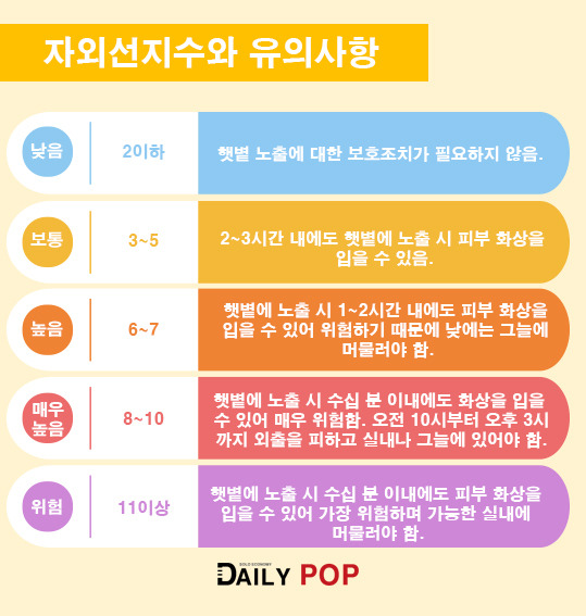 - Extreme (11+): 외출 금지, 자외선 차단제 필수