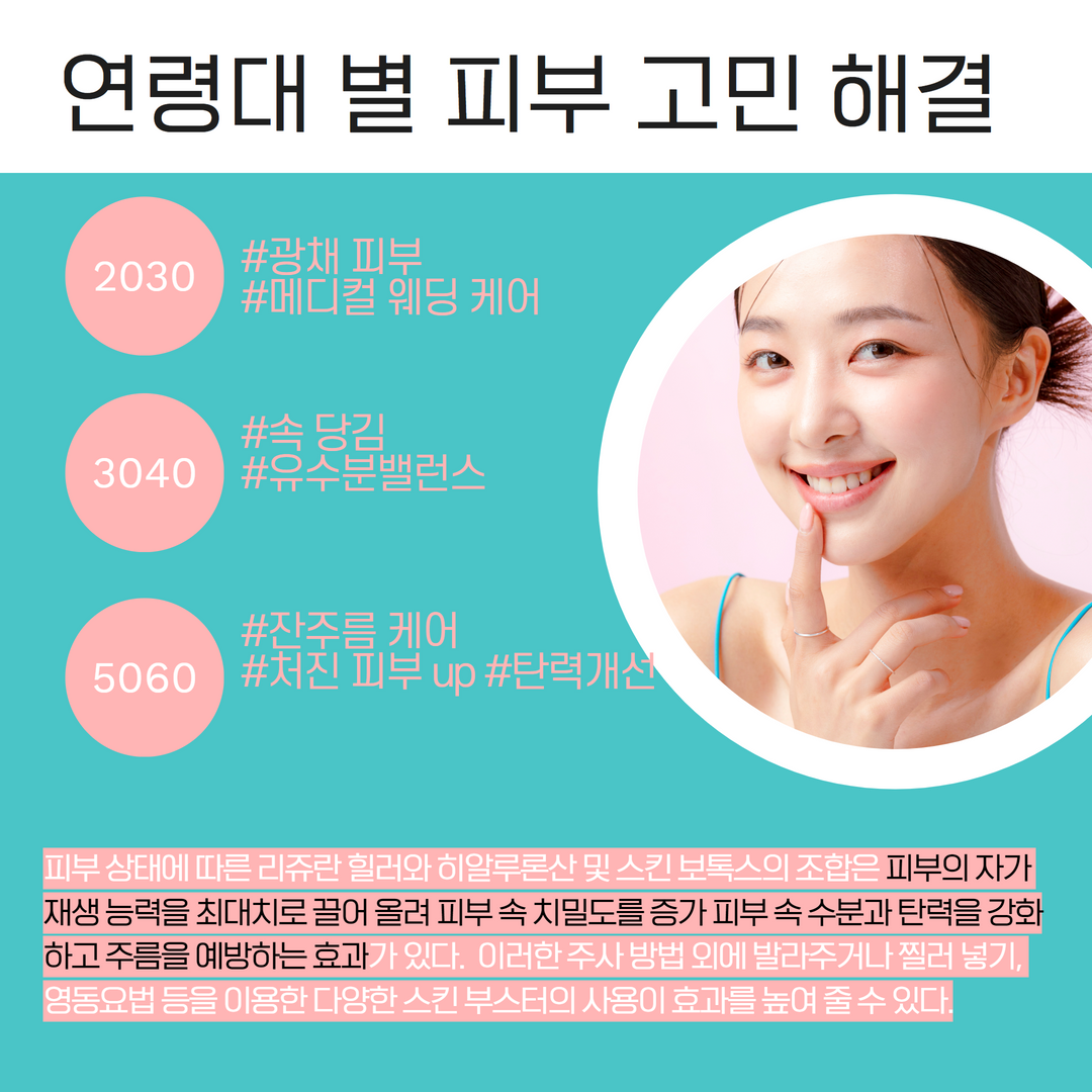 연령대에 따라 피부 고민이 다르게 나타납니다. 2030대는 주로 미백과 트러블이 주요 고민입니다. 이 시기에는 피부가 가장 건강한 상태이지만, 스트레스나 환경적 요인으로 인해 트러블이 발생할 수 있습니다. 3040대는 보습과 탄력이 중요해지며, 피부의 노화가 시작됩니다. 이 시기에는 충분한 수분 공급과 함께 탄력 있는 피부를 유지하기 위한 노력이 필요합니다. 5060대는 주름과 처짐이 주요 고민으로, 전문적인 스킨케어가 필요합니다.