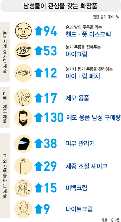 60대 남성들이 선호하는 화장품 카테고리는 다양합니다. 최근 조사에 따르면, 손과 발 마스크, 아이크림, 립케어 제품 등이 인기를 끌고 있습니다. 특히 손과 발 마스크의 사용 비율은 94%에 달하며, 남성 그루밍 제품의 사용 비율은 130%로 증가하였습니다. 이러한 변화는 남성들이 피부 관리에 대한 인식을 새롭게 하고 있다는 것을 보여줍니다.